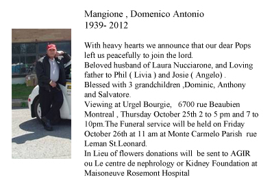 It is with deep regret and sorrow to announce that Mr. Domenico Mangione, one of the founding members of the Association Frosolonese Inc. and a former President and Secretary has passed away. It was Mr. Mangione's passion for his cultural heritage and fond memories of the little village that he left behind in Frosolone that helped build our Association Frosolonese to give it the success that it enjoys today. On behalf of all members of the Association Frosolonese, we would like to express our deepest sympathies to the family and friends of Mr. Domenico Mangione.