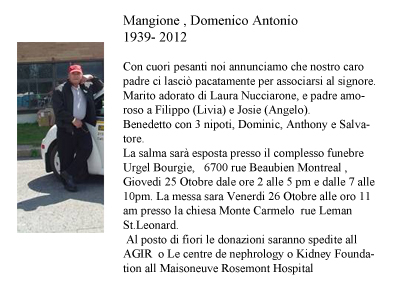 Con profondo dolore annunciamo la morte del nostro Domenico Mangione, membro fondatore della Associazione Frosolonese in cui ha ricoperto vari incarichi, in diversi momenti, nelle funzioni di presidente e di segretario. Il suo notevole contributo al successo della nostra associazione, di cui godiamo oggi, deriva dalla sua passione per il suo patrimonio culturale e bei ricordi del piccolo paese che ha lasciato a Frosolone. Sembrava di essere sempre presente nella nostra associazione, anche quando non lo era, ed era disposto a dare il meglio di se stesso, al fine di far brillare il meglio di ciò che siamo, che è Frosolonesi. A nome di tutti i membri della associazione Frosolonese, vorremmo esprimere le nostre più sentite condoglianze alla famiglia e agli amici del sig. Domenico Mangione. Possa adesso riposare in pace in cielo nella gloria di Dio!