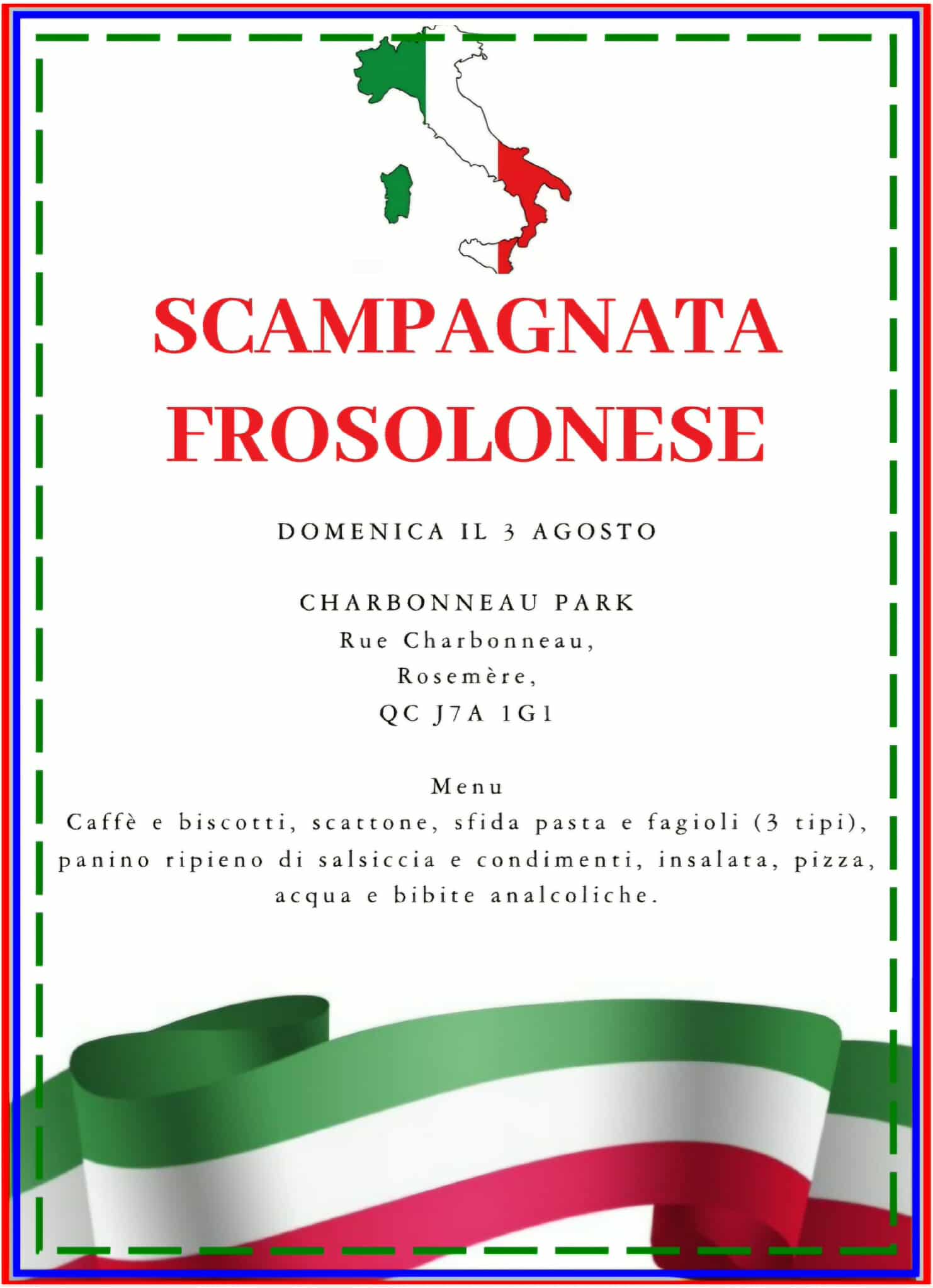 Sarà una Scampagnata speciale, che celebrerà i 50 anni di amicizia e cultura Frosolonese in Montreal. Celebriamo i nostri membri fondatori, i devoti membri del consiglio nel corso degli anni e, soprattutto, la nostra ricca cultura Frosolonese circondati da amici e familia.