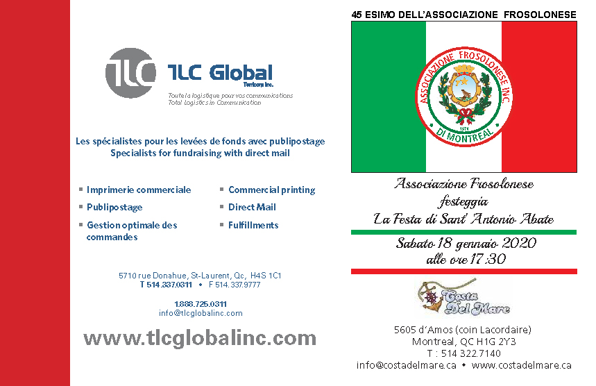 Sarà una Festa di Sant'Antonio speciale, che celebrerà i 50 anni di amicizia e cultura Frosolonese in Montreal. Celebriamo i nostri membri fondatori, i devoti membri del consiglio nel corso degli anni e, soprattutto, la nostra ricca cultura Frosolonese circondati da amici e familia.